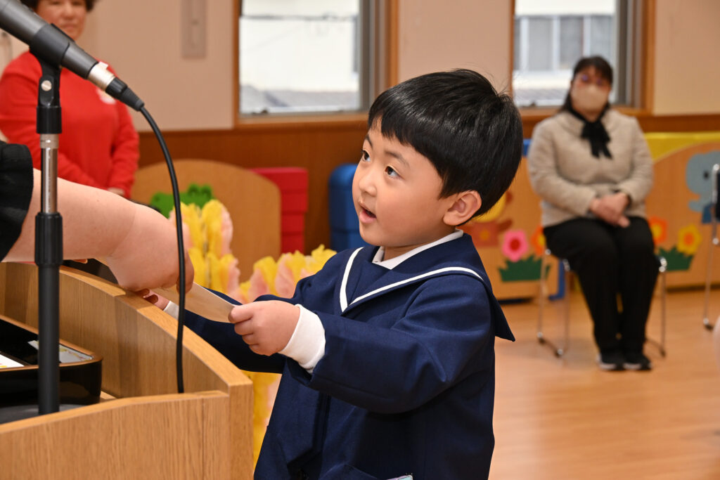 クラスの代表のお友達が園長先生から修了証書を受け取りましたよ♪